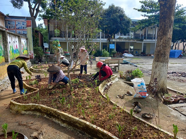 Chỉnh trang khuôn viên, nhất là đối với khuôn viên ngoài trời nhưng với không khí khẩn trương, sôi nổi đón chào năm học mới, tất cả cán bộ, giáo viên và phụ huynh, học sinh đều có mặt để tu sửa, dọn dẹp khuôn viên của nhà trường, sắp xếp, trang trí phòng học. Những năm gần đây, được sự quan tâm đầu tư của tỉnh và huyện, sự nỗ lực cố gắng của cô và trò nhà trường, đặc biệt là phát huy công tác xã hội hóa giáo dục, cơ sở vật chất của nhà trường ngày càng khang trang, sạch đẹp. Công tác chuẩn bị năm học mới được nhà trường đặc biệt chú trọng, từ khâu dọn dẹp đến sắp xếp đồ dùng, trang trí khuôn viên... để chuẩn bị đón các em học sinh bước vào năm học mới.