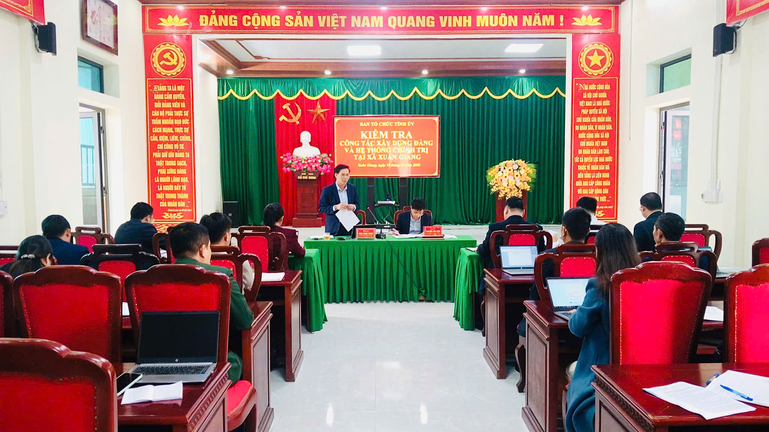 Tại buổi làm việc, Đảng ủy xã Xuân Giang đã báo cáo kết quả triển khai công tác xây dựng Đảng, hệ thống chính trị, tập trung vào các nội dung trọng tâm như: Việc ban hành và thực hiện quy chế làm việc của Đảng ủy, Ủy ban Kiểm tra Đảng ủy; công tác tổ chức, cán bộ; phát triển và quản lý đảng viên; đánh giá, xếp loại tổ chức đảng, đảng viên, cán bộ, công chức năm 2025; việc triển khai thực hiện nghị quyết đại hội Đảng bộ các cấp nhiệm kỳ 2025-2030; công tác bảo vệ chính trị nội bộ và ứng dụng sổ tay đảng viên điện tử. Trên cơ sở báo cáo và kiểm tra hồ sơ, tài liệu.