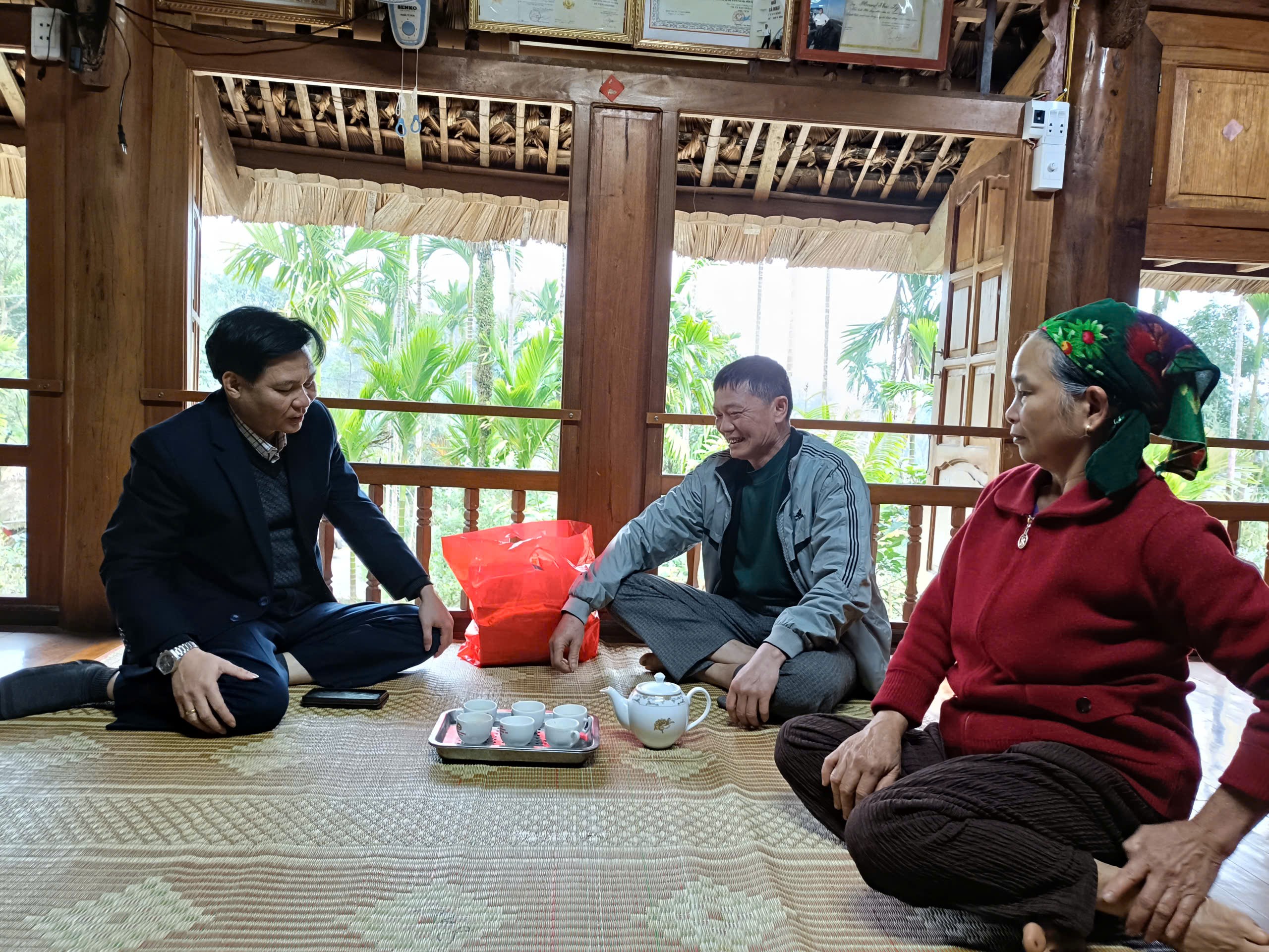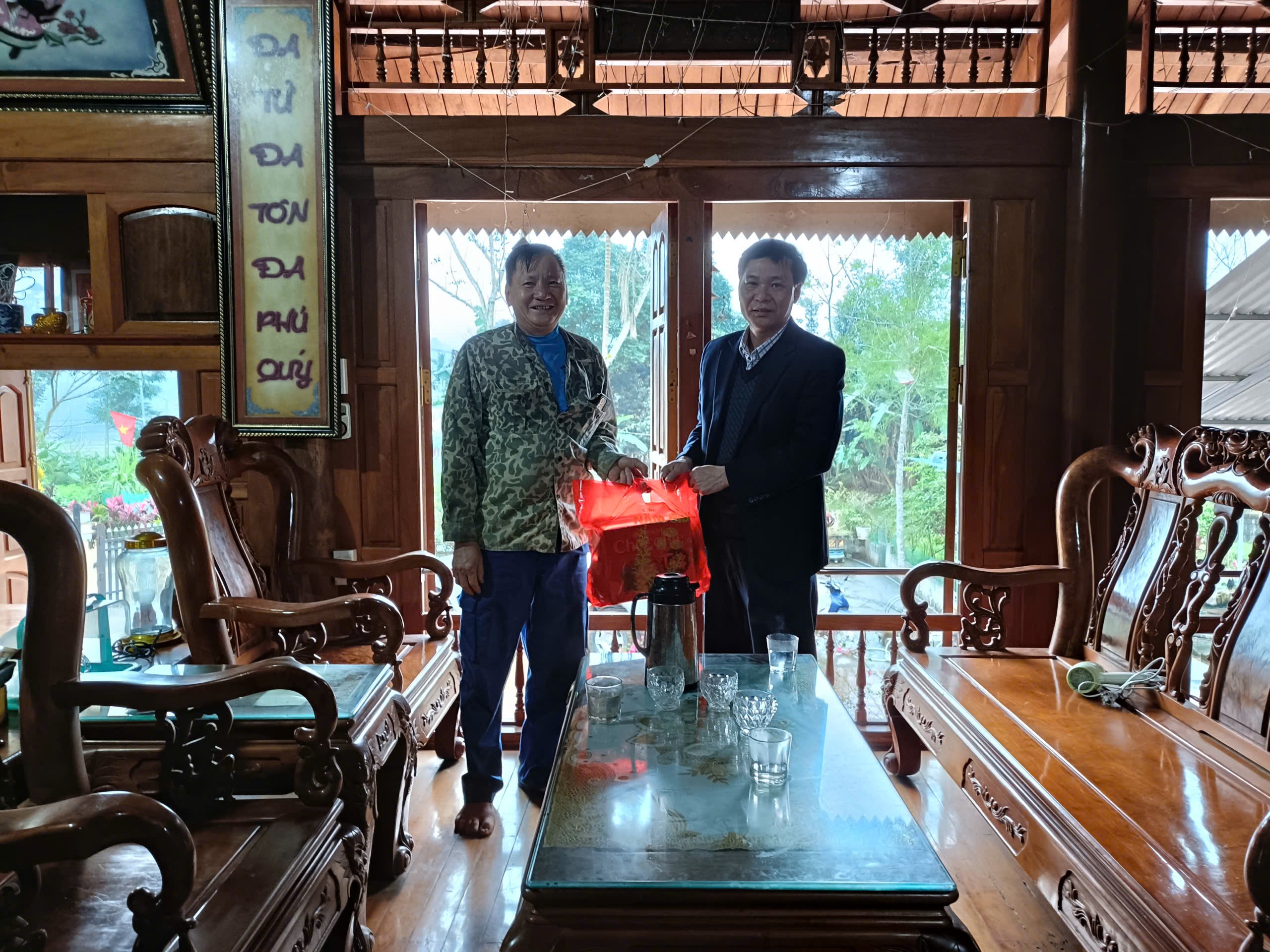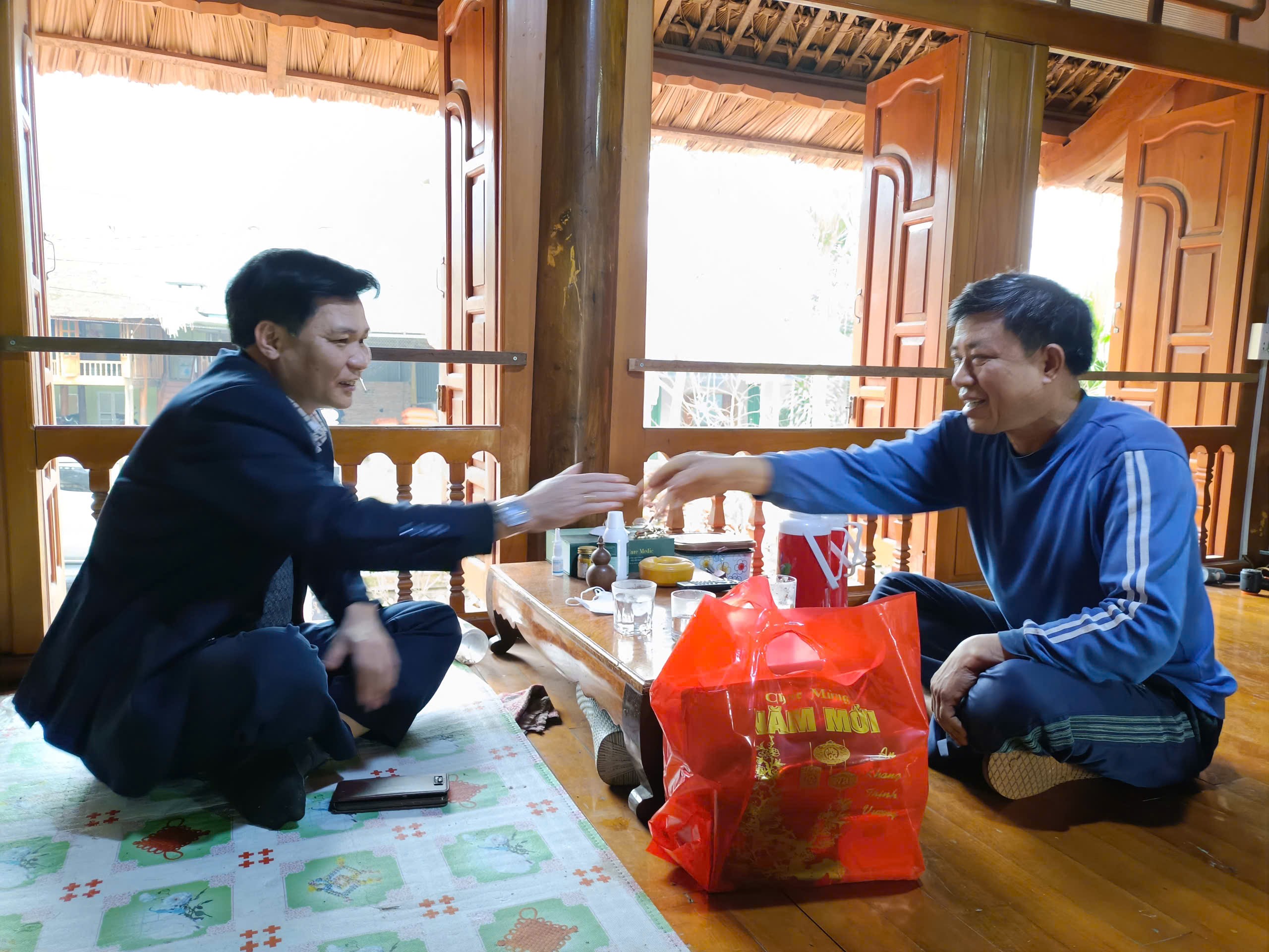 Đồng chí Trần Trung Thành - Bí thư Đảng ủy, Chủ tịch HĐND xã đến thăm hỏi, tặng quà đồng chí Hoàng – Tựt, Nguyên Chính ủy, Bộ đội biên phòng tỉnh.