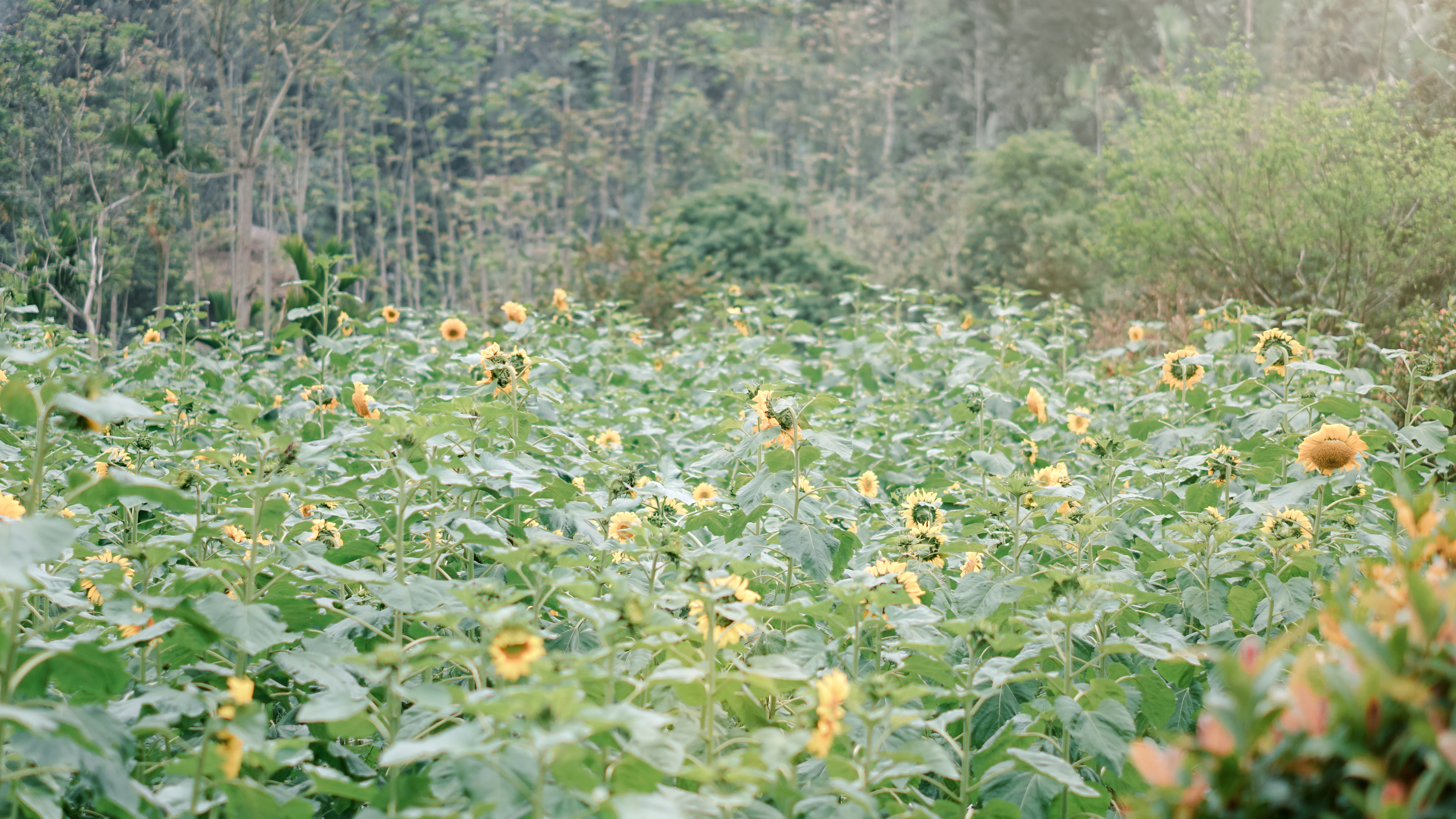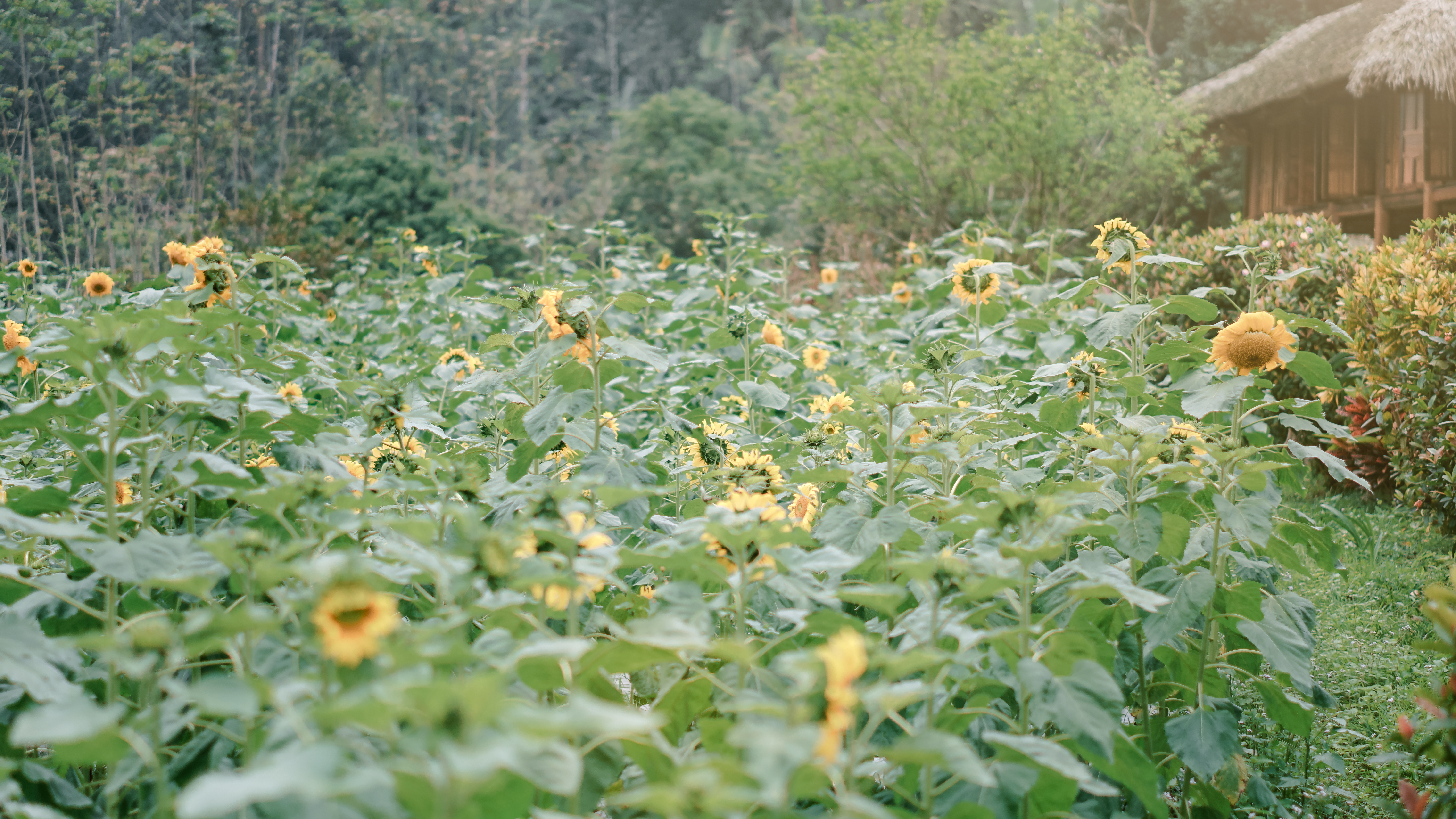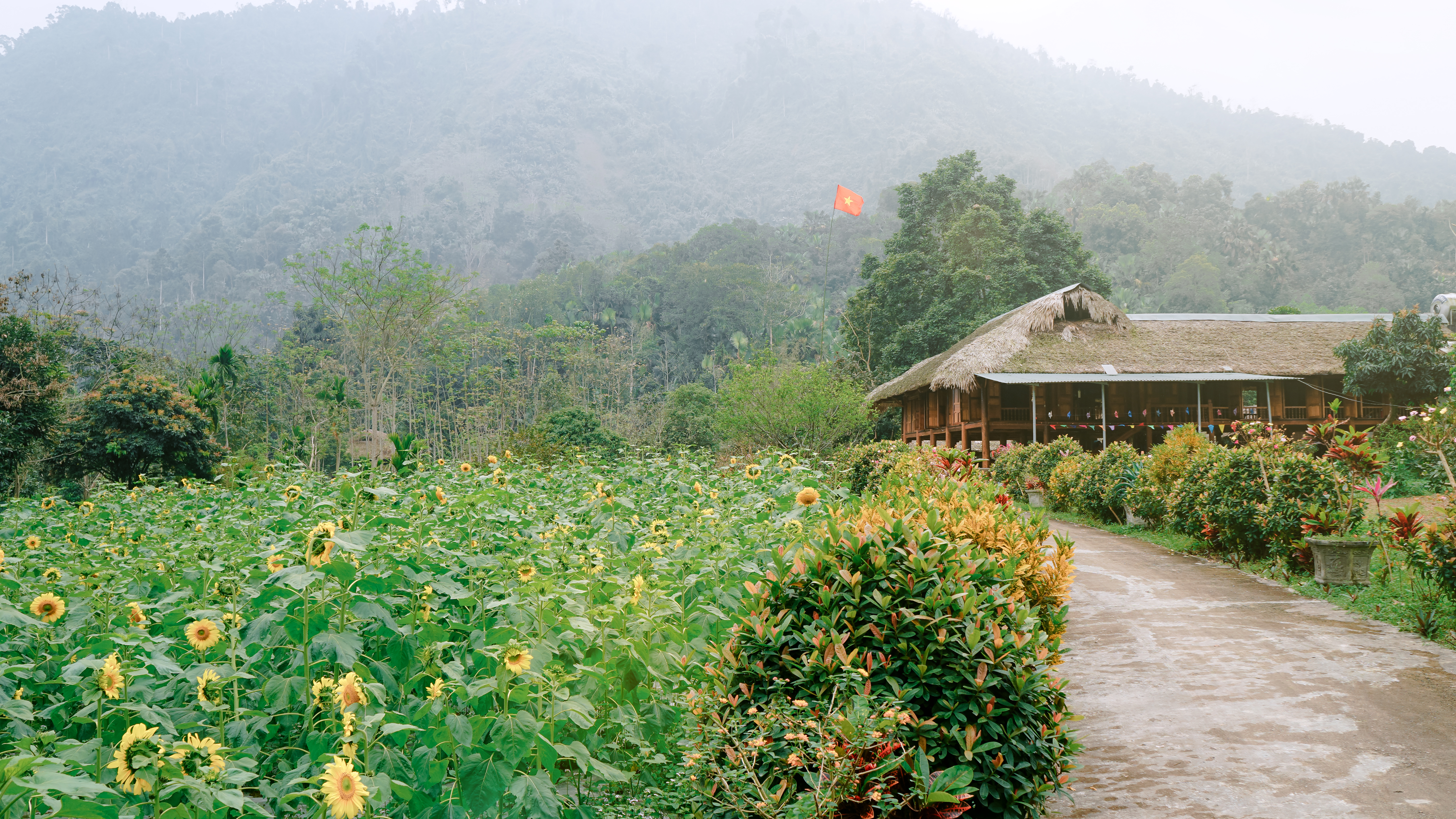 Những bông hoa Hướng Dương nở rộ bên ngôi nhà sàn mộc mạc nép mình dưới chân núi