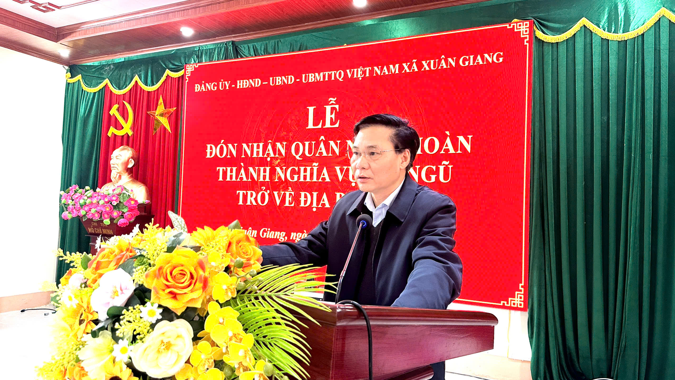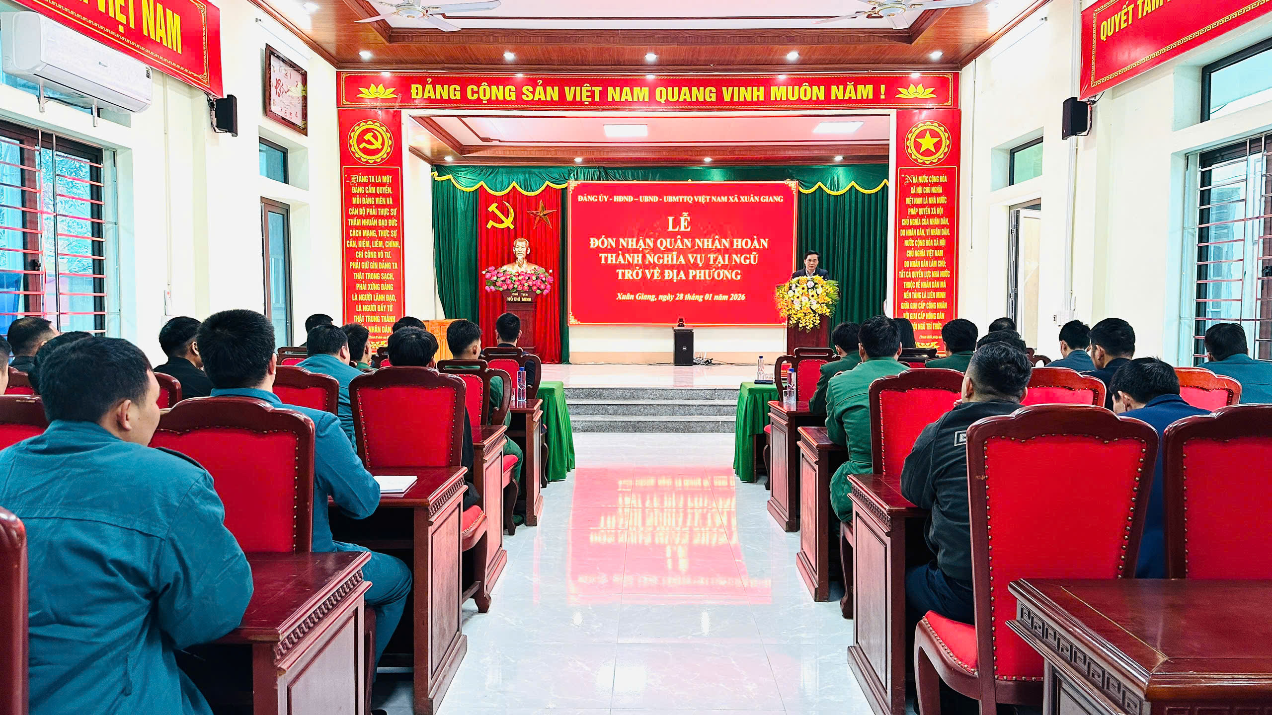 Phát biểu tại buổi lễ, đồng chí Trần Trung Thành – Bí thư Đảng ủy xã Xuân Giang ghi nhận và đánh giá cao tinh thần trách nhiệm, ý chí rèn luyện và sự trưởng thành của các quân nhân sau thời gian tại ngũ. Đồng chí nhấn mạnh: việc hoàn thành nghĩa vụ quân sự không chỉ là niềm tự hào của bản thân mỗi quân nhân mà còn là niềm vinh dự của gia đình và địa phương. Đồng chí Bí thư mong muốn các quân nhân xuất ngũ tiếp tục phát huy phẩm chất “Bộ đội Cụ Hồ”, gương mẫu trong sinh hoạt và lao động, tích cực tham gia phát triển kinh tế, xây dựng nông thôn mới, giữ gìn an ninh trật tự tại cơ sở; đồng thời sẵn sàng nhận và hoàn thành tốt mọi nhiệm vụ khi Tổ quốc cần.